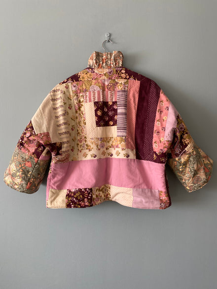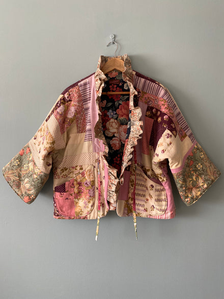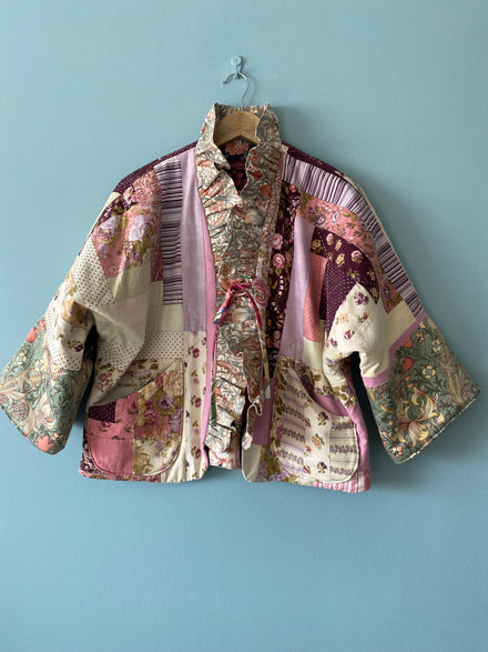 This beautiful quilted jacket is made from a vintage patchwork quilt. The interlining makes it cosy and warm. The bottom parts of the sleeves and the ruffled collar are made from Golden Lily by William Morris.