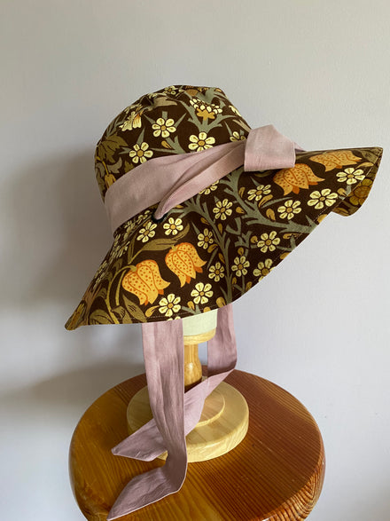 Made from the beautiful Blackthorn by William Morris, and a pink Chambray bow with chin ties. It is lined with pure cotton fabric.